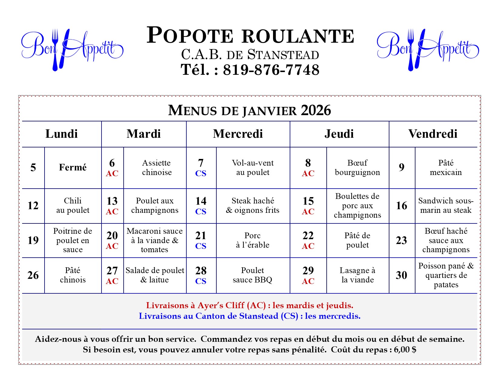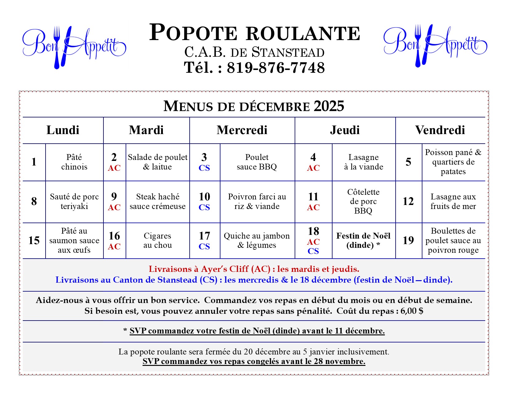 Le CAB est fermé du 20 décembre au 5 janvier à 10h00. La popote roulante est de retour le 6 janvier. Le comptoir familial est fermé du 19 décembre au 12 janvier inclusivement. Le P.A.C.E. reprend ses activités pour les enfants et leurs parents le 7 janvier. Joyeux temps des fêtes!